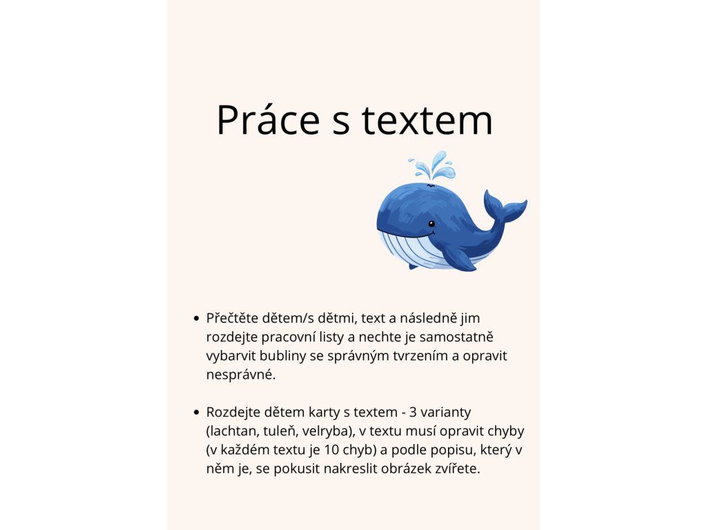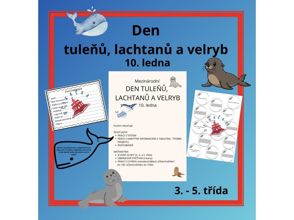 Materiál k projektovému dni na téma ,,tuleňů, lachtanů a velryb". Obsahuje materiály do českého jazyka a matematiky. Děti se dozví něco zajímavého o těchto zvířatech, budou pracovat s textem, slovními úlohami i chybami.
