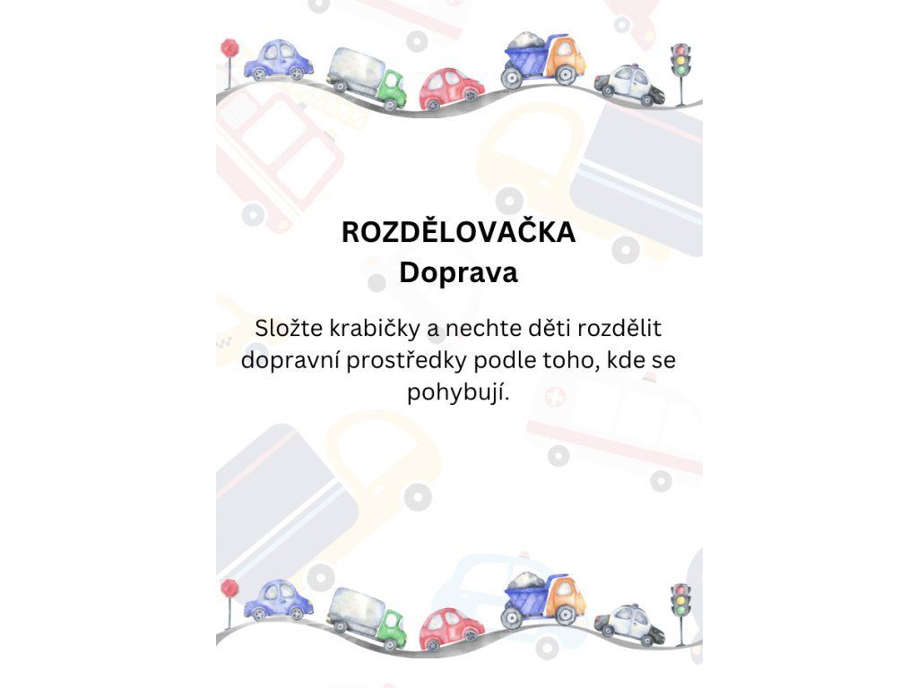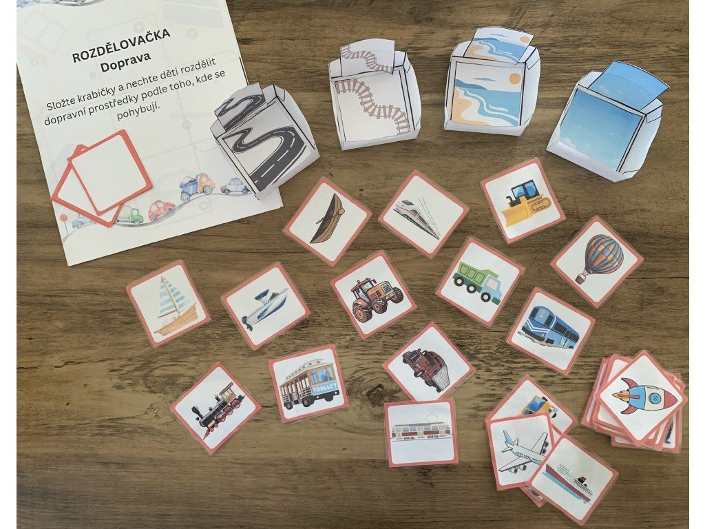 V souboru naleznete kartičky s dopravními prostředky a šablony krabiček ke složení. Děti budou prostředky skládat podle toho, kde se pohybují.