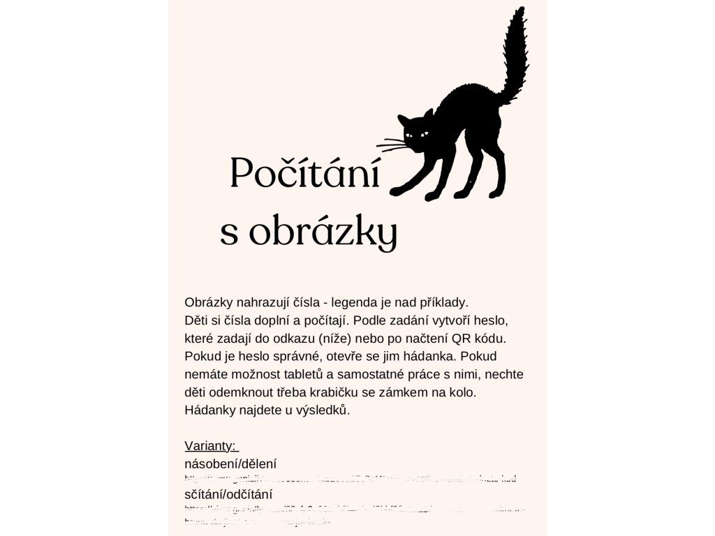 Dokument obsahuje aktivity do matematiky. Děti budou pracovat v pohybu, učit se pracovat s chybou a taky s elektronikou. V souboru najdete hru, která prostupuje počítání až ke QR kódu a hádance.