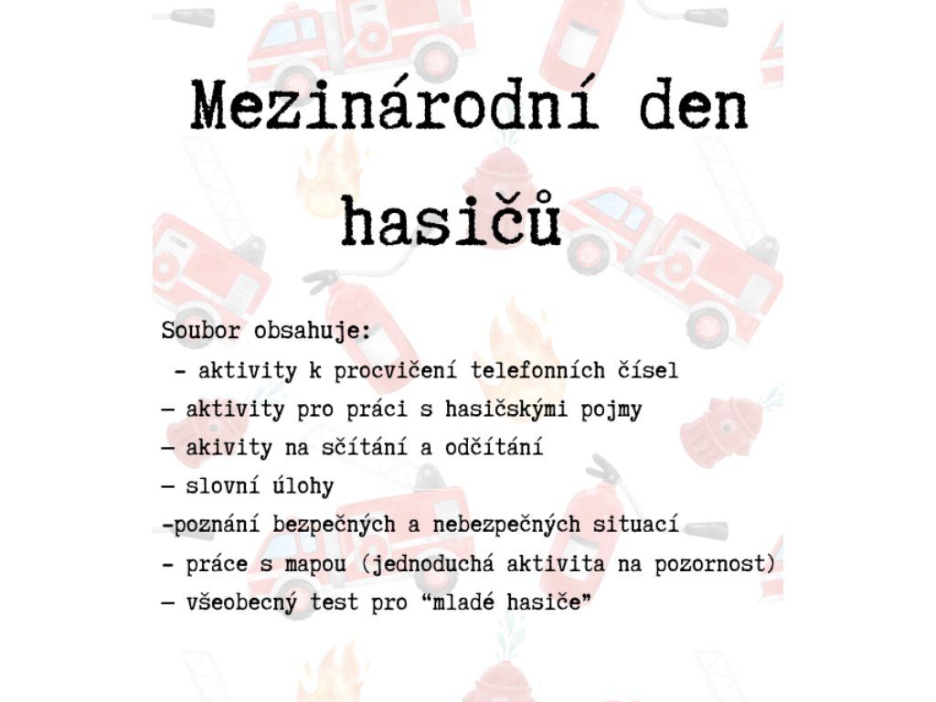 Soubor obsahuje aktivity, které dětem přiblíží jak práci hasičů, tak činnost kolektivů mladých hasičů. Hravou formou si procvičí matematiku, atp. Ale také si vyzkouší něco nového, např. práci s topografickými značkami.